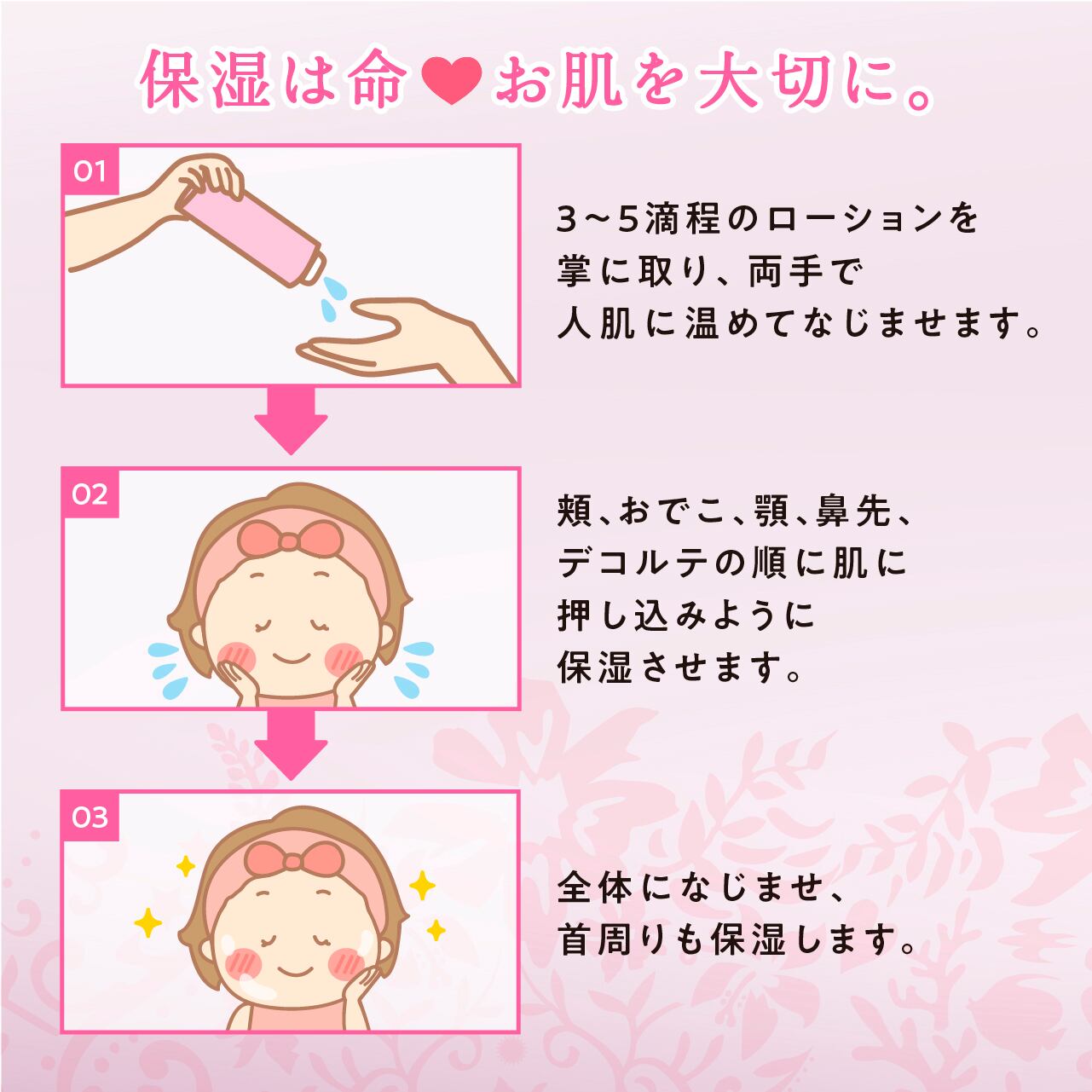 モイスチャーミストで肌を潤したのち、たっぷりとモイスチャーローションを手のひらに取り、保湿してください。両手で頬を包み込むようにし、角質層が保水されるまで、手のひらでプッシュします。両頬、おでこ、顎、鼻先、首と全体に保湿していきます。