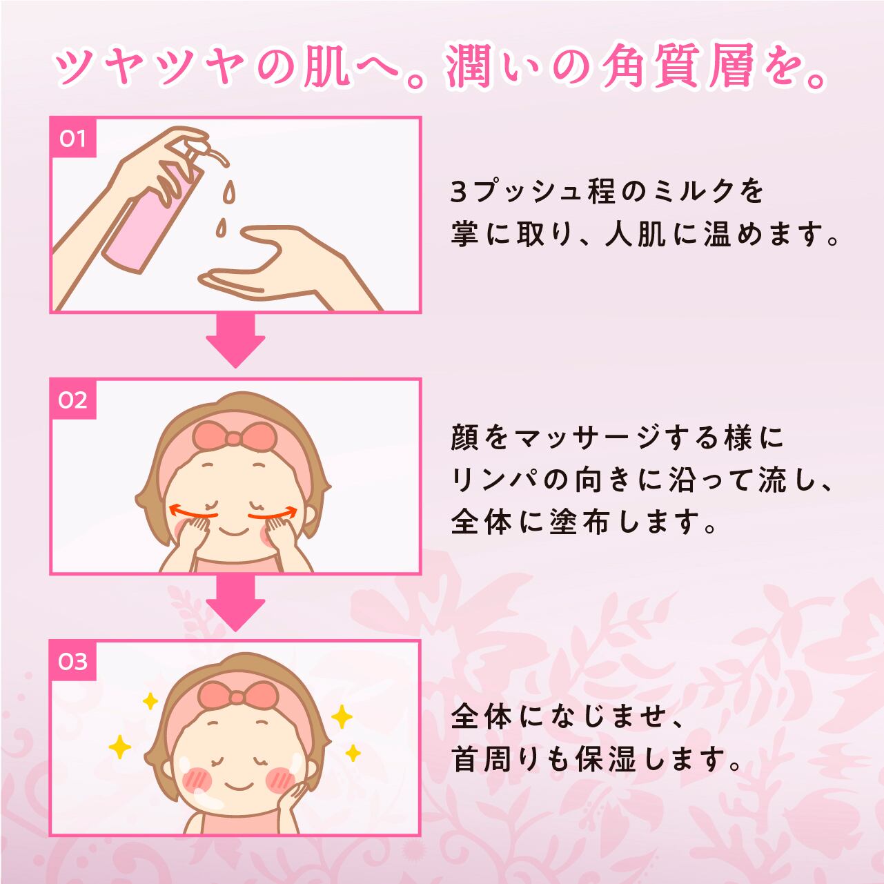 モイスチャーローションの後、2〜3プッシュほどのミルクを手のひらに取り、お顔をマッサージするように全体に塗布します。リンパの流れに沿って行うと、小顔効果も☆☆☆