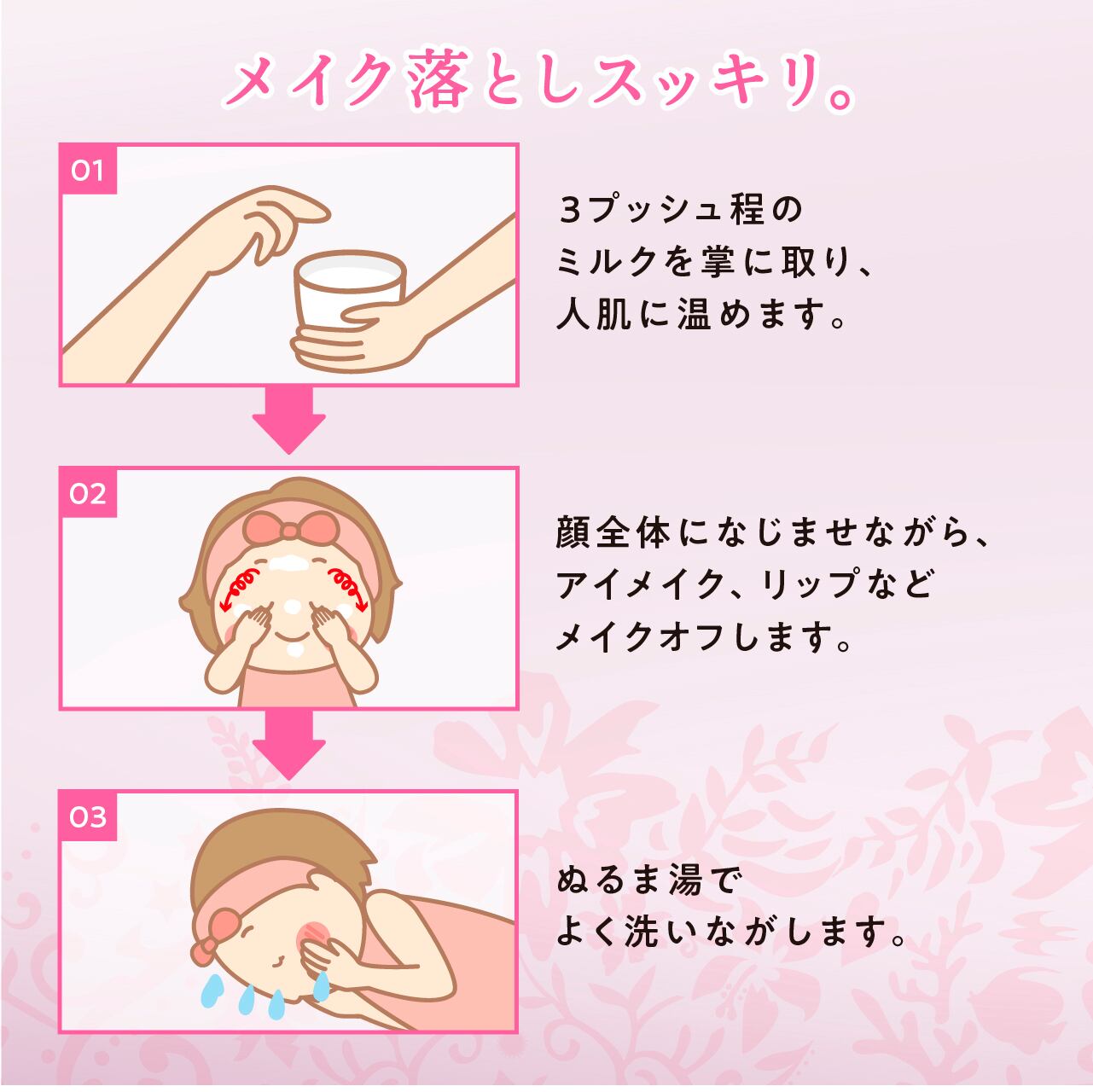をお顔全体に塗り広げ、目の周り、リップなどメイクが落ちにくい場所を中心に優しくマッサージしましょう。
