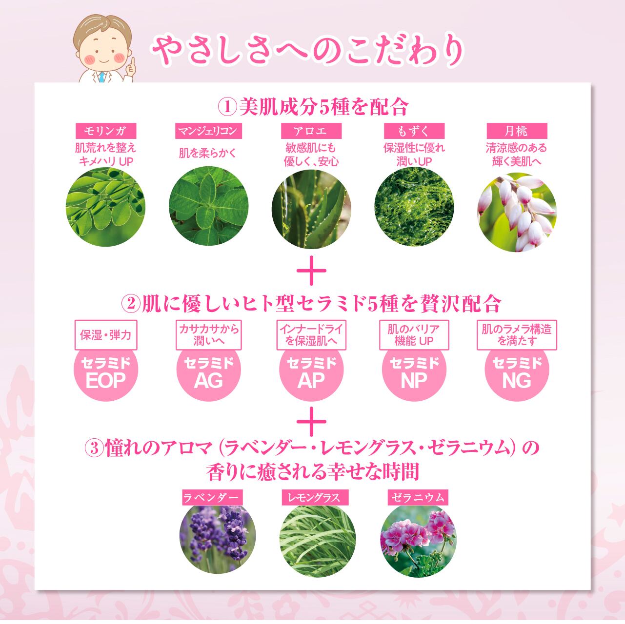 【全成分】水、トリイソステアリン酸PEG-20グリセリル、シクロヘキサン-1,4-ジカルボン酸ビスエトキシジグリコール、オクチルドデカノール、BG、グリセリン、ゲットウ葉エキス、マンジェリコンエキス*1、モリンガエキス*2、アロエベラ液汁、オキナワモズクエキス、ラベンダー油、ニオイテンジクアオイ花油、レモングラス油、ホホバ種子油、セラミドEOP、セラミドNG、セラミドNP、セラミドAG、セラミドAP、ペンチレングリコール、水酸化K、グリチルリチン酸2K、カルボマー、水添レシチン、フィトステロールズ、フェノキシエタノール、 *1メボウキエキス、*2ワサビノキ葉エキス